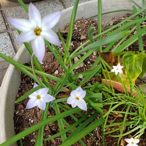 ハナニラ 庭のあちこちに自生するハナニラの球根をプランター上げしたものが、 出そろって来ました(^^) 自生より花の色が薄いのがちょっと残念ですが、大好きな一つです(^^)