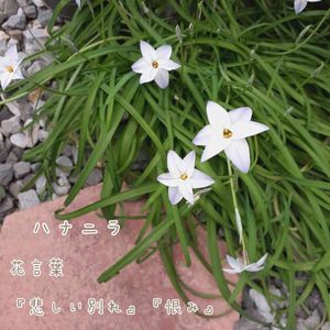 由来 ハナニラの花は青や白い色をしており、それが悲しい雰囲気を連想させることから「悲しい別れ」がつけられたと言われています。 ❁❀✿✾❁❀✿✾❁❀✿✾❁❀✿✾❁❀ 星のような形をした白や青紫色の花を咲かせる多年草。 秋に球根を植えると3月から5月にかわいらしい花を咲かせます。 (*ˊ˘ˋ*){近所に野良のハナニラが沢山咲 いているよ。 ニラのような細い葉の茂みから花茎が立ち上がって、茎の先端に直径3㎝ほどの6弁の花が平らに開くのが特徴です。 6弁の花の形から、英語ではスプリングスターフラワーとも呼ばれます。 ( * ॑꒳ ॑*){たしかに、星型だね。 また、ハナニラは葉や茎が傷つくことでニラのような匂いを出します。 (´・-・` ){ニラより、強烈かも…。 群生して、咲く可憐な姿が可愛らしくて春になると開花が待ち遠しくなる花です。