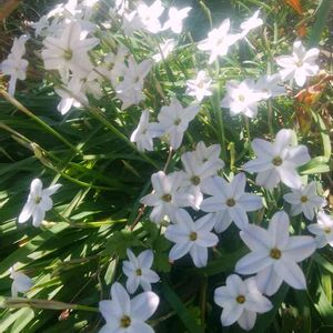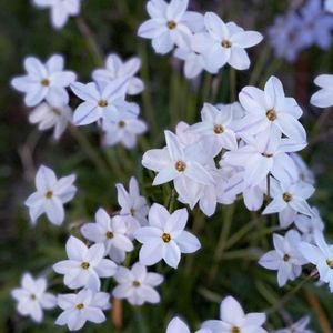 夕方ワン🐕の散歩で多摩川まで👟 帰り道ふと見ると小さな広場に点々と白く輝くものが。 近づいてみると真っ白いハナニラの花でした。 往きは気がつかなかった 薄暗がりに白く浮かび上がり幻想的でした。