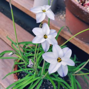 「ハナニラ(イフェイオン)」です✨ 小さなお星さまのような可愛いお花が咲きました🎶 水色と白の混合の球根を植えたのですが、白が目立ちます♡ 車庫の前の小さなスペースで、可憐に咲いてくれています・・・🥰
