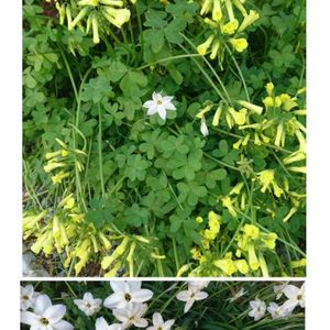 3/21(木)⑥ 上::黄色いオキザリスに囲まれ「私が主役‼」と 姫様なハナニラ✨✴️✨ 下::遊歩道のハナニラ。やっぱり群生してる方がハナニラらしい感じ🤣