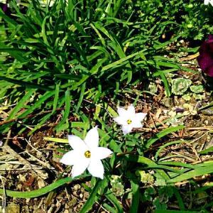おはようございます(^-^) 「ハナニラ」 花言葉…耐える愛、星に願いを 別名に「ベツレヘムの星」 柵越えの顔が可愛い、地上に咲く星🌟
