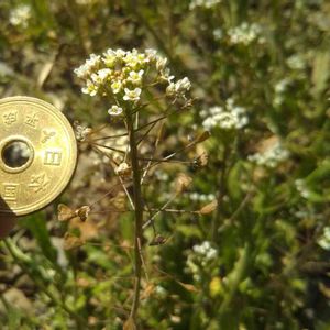 5円玉と比較シリーズ⑧ 白いお花です。 先端に小さな白い花が集まっている感じに見えます。 どなたかお花の名前を教えてください!