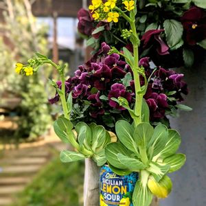 春先の庭にポタジェガーデンっぽく ミニチンゲンサイとビオラを植えましたが、チンゲンサイのお花がきれいに咲いています。種取りするつもりです。ビオラももうそろそろ終わりです。チンゲンサイの緑色とビオラの紫色がとてもきれいで、楽しませてくれました🌿🪻