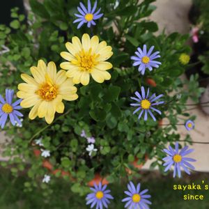 おはようございます😃 ブルーデイジーと黄色いマーガレットの寄せ植え💙💛