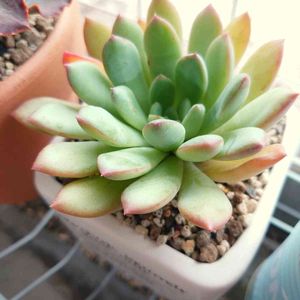 こんばんは٩(๑>◡<๑)۶♡ 『ピーチ姫』✨念願のピーチ姫✨ 二和園で破格でお迎えした子です。 ブロンズ姫の斑入り(❁´ω`❁) この子は増やしたい💕増やすなら今。 でも葉挿しにするには小さすぎる💦 チョンパかなぁ。 ブロンズ姫のように強いなら潔くいきますが💦 斑入り。慎重に慎重に( ,,-` 。´-)✨