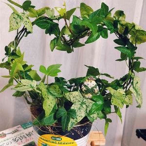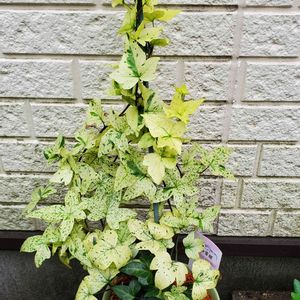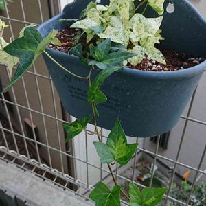 ヘデラ 白雪姫🤍💚 冬のあいだスリットバスケット寄せで活躍してくれたヘデラ 解体し短くカットして おひとりさまに🤍💚 夏の直射日光で葉焼けすると 斑入り部分のダメージが見苦しいので 次のパンジービオラと寄せる頃まで軒下暮らしのお姫さまでいてもらいます😊
