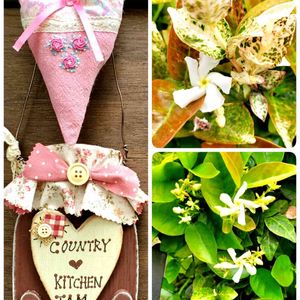今晩は😄👋 ハツユキカヅラに今年は沢山花芽がついて咲いています💕 母の日 何をねだろうかとフリマへ 左下の手作りプレート可愛かったのでこれと多肉やお花も勝手に買ってきて子供たちにおねだり~🎵😍🎵 秘密の小屋のドアの裏側に吊るしました🎵上のハートは刺繍の先生からのプレゼント💕一緒に飾ってみました😄💕