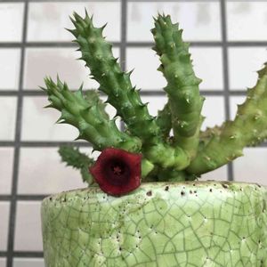 ガガ様が咲きました🎵🤣 フェルニア黄蛾角 なにやら中国人の名前みたいな? 名前に黄とつくのに赤い花😅 つぼみ4つに花が2つ。 全部が収まらないのが悩ましいところです。 匂い?( ・∋・) 怖くて嗅げません。
