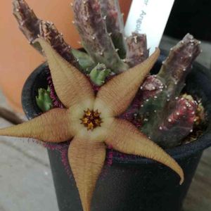 スタぺリアアンゴレンシス とうとう、お花が咲いた🎵 まさしく、陸のヒトデ キモイ(|||´Д`)‼️ 臭いはキョーレツではないけど 栗の花みたいな、独特の臭い。 宇宙生物みたいですね。( ・ω・)