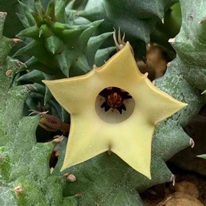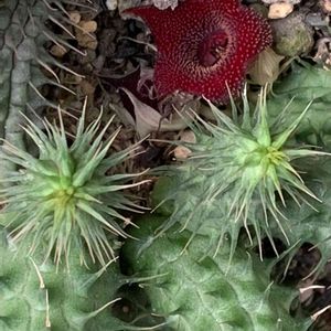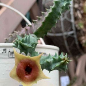 ガガ様 もう一鉢の 多分 スタペリア ヒルスタ 本体が分かりにくいですが、 30センチの長さがあり、 太さはそんなに無いけど 名無しで買ったので、ひょっとして ギガンティアかも😆と思いましたが、 お花見たらヒルスタみたい😆