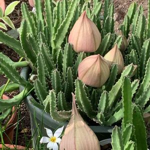 スタぺリア ヒルスタ やっと膨らみ色付いてきました😊 恐ろしい香りと、 不気味なキモ美しい花、 フフッ🤭 楽しみです💓 蕾、長さ7cm.一番太い巾4.5cm 後ろにチョコっと咲いているのは蛾角💕 可愛い~です🤗