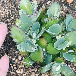 子宝草。 おはようございます、雨です☔️ 赤ちゃんから更に赤ちゃんが出てきています(サイズこんなもん) ポットに植えて実家にあげたりしていましたが、増えまくるので 玄関脇に群生のまま植えました。 切磋琢磨して残った子を育てればいいかなーって。 親株の方は子供に蹴飛ばされたりして、毎日子株がアチコチ吹っ飛んでます🤣