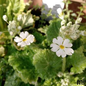 プリムラ・マラコイデス うぐいす ホワイトが咲き始めました🌼 11.15 1苗100円で2苗購入して 新しい鉢に植え付けて投稿したこです 2苗のはずが4苗になってスクスク成長してますよ🤭 分身の術〜で 2倍 2倍✌の ハート型の可愛い花を楽しんでます 赤色の開花は まだなんデス🤗