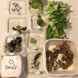 ✤素敵便🎁✤ フォロワーのたみにくちゃんへ 桜吹雪の種を送ったら 可愛い子が我が家へやって来ました🏠 いらっしゃーい(w>u<)人(>o<w)ようこそ! 初めましての品種が5つも❗👀 1番びっくりしたのは左上にある 姫宮(灰)さん❗ こんなの初めて見たょ〜( ⊙_⊙) 調べたらカランコエ属なんだね〜⤴️ 葉挿しなんだけどちゃんと根っこが付いてるの❗ これはどんな風に育っていくのか? 成長する様子が楽しみだな🎶 細葉ボルケンシーは花芽が付いてるから お花を咲かせられるように頑張ります(๑و•̀ω•́)و そして、いつかお迎えしたいと思っていた 白斑の熊童子錦🐻(黄斑は持ってるの) 可愛いね〜可愛いね〜💖(*´ω`*) 沢山増やしたいーーー❗頑張る(笑) たみにくちゃん💕どうもありがとう✨🥰 一日中雨で多肉ゴトが出来なくて 残念な土曜日が 一気にうきうきになりました*\(^o^)/*🎉