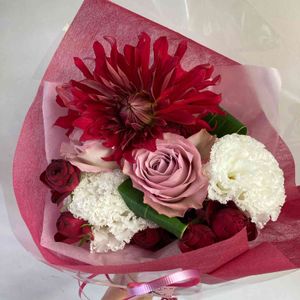 写真の花は、送別用の花束です💐 . . ▶︎ダリア 純愛の君 ▶︎バラ ラプソディ ▶︎スプレーバラ ガーネットジェム ▶︎トルコキキョウ . . 是非他のお花などもご覧下さい✨✨ ____________________________ ◽︎Atelierk 【エリア】 大阪 / 淀屋橋 【営業時間】 [月〜土]10:00~19:00 [日・祝]10:00~18:00