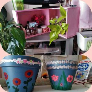 散歩に行かずに😒 上は頂いたトール様の木箱をピンクに塗りTV台を作製 下はピカソもビックリの鉢 笑って下さい〜しかし 奇跡が、近所の方がお金払うから売ってですと😨 お金は頂きません。物好きな方も居らっしゃる😂 これは4歳の孫が描いたのと言うつもりでした!