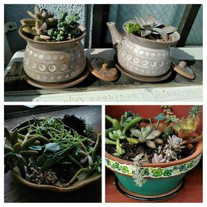 こんにちは✋良いお天気ですね🌼🌼 昨日、左下❣多肉植物を頂きました🌿🌿 上は終活で捨てる新品の土瓶蒸し用も頂き 制作そして差上げました🌿🌿と言っても 隣の室外機の上😁仕切が無いので私の物😆