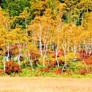 湿原の紅葉 𓍯·˖* 過去写真です 志賀高原 田ノ原湿原 草紅葉や白樺紅葉 手前の濃いオレンジ色の紅葉は何かな? コントラストが美しい場所です✨