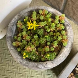 トリカラーはわかったんだけど、不明セダム2種 黄緑は、ゴールデンカーペットかミモザかスターダスト?? 追記 緑は…オカタイトゴメ!とわかりました! ありがとうございます☆