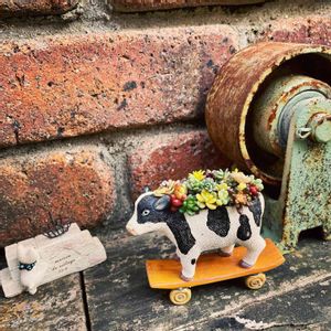 なぜ、牛がスケボー⁉️😵と不思議で面白可愛い小さな鉢です。