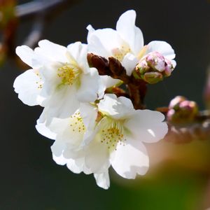 陽光桜(ヨウコウザクラ) バラ科サクラ属の落葉高木。広義のソメイヨシノの一種『天城吉野(アマギヨシノ)』と寒緋桜(カンヒザクラ)の交配により作出され、1981年に登録された栽培品種。アマギヨシノはオオシマザクラとエドヒガンを交配して作った個体。大型で色の濃い花が多数咲き華やかであるため、各地の公園などに植えられている。若芽は緑褐色で花のあとから伸びる。 出典『日本の桜』『サクラ ハンドブック』