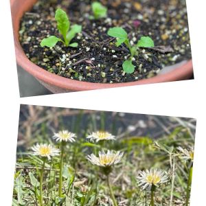 🌱シロバナタンポポ🌱 芽が出ました❣️ お花見に行った川沿いに咲いていたシロバナタンポポ、綿毛を持ち帰り鉢いっぱいに撒き、残りは庭のあちこちに撒き散らしておきました。 芽が出た時は??タンポポのかな〜🧐 半信半疑でいましたが、間違いないでしょうか😅 たくさん蒔いたのに出たのは5つ💦 植え替えとかしなくてこのままでいいのかな?