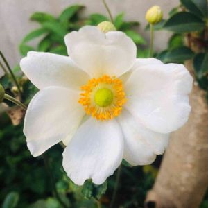 モッコクの新芽🌱と シュウメイ菊😽 庭のモッコクに秋明菊が 支えられて咲いてますʕʘ̅͜ʘ̅ʔ まだ白の秋明菊はツボミの ままですʕ·͡ˑ·ཻʔ
