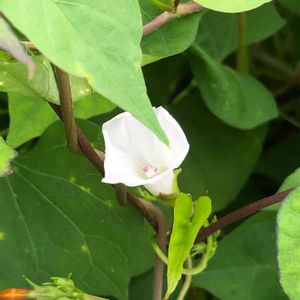 丸葉縷紅草に絡んでいた白い花です。 豆朝顔ではないかと思うのですが、午後3時なので花が萎みかけているのかしら? 豆朝顔に見られる尖った五角形の花が見られなくて、最初はシロバナルコウソウかなと思ってしまいました。