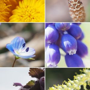近づいてみたシリーズ🔎 ↖タンポポ ↗つくし →ムスカリ ↘柳の花 ↙ヒメオドリコソウ ←オオイヌノフグリ