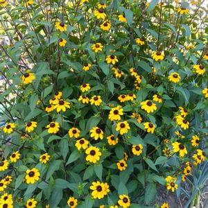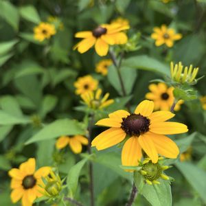 ルドベキア タカオ 🌼が、たくさん咲く 季節に なりました。。。 結構、大きく、背も 高くなるので、今年は、事前に 剪定 ちょこ ちょこしたから、支柱無しだけど、シッカリ 立っています〜❗️ 溢れ種で 発芽🌱した株は、拾い上げて いくつか 鉢植えにも しています‼️