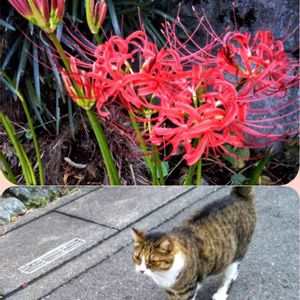 お散歩で見つけた今日のお花 ヒガンバナとちょっとだけお散歩について来てくれた人懐っこいご近所にゃんこ😺