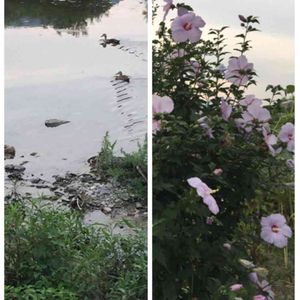 今頃なんですけど、 今日の早朝散歩🚶 左: 川辺の緑と水鳥のカップル💕 右: ムクゲの花、優しい色合い❣️