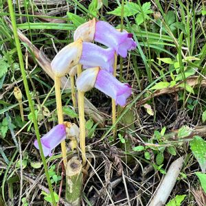 250921今日のお花 ナンバンギセル 毎年観察している野川のススキ原の子が 今年は不作で諦めていたのですが、 思わぬ所で出会いました✨ 両親のお墓近く、県道沿いの生姜?茗荷? の群生の根元です→やなさんの記事で茗荷と判明。やなさん、ありがとうございました‼︎ へぇ〜ススキじゃなくても咲くんだ! いつも野川で見る子よりも ちょっと色が薄めでした。 菌従属栄養植物の🏷️を付けようと思って調べてみたら、菌ではなく完全に宿主に 寄生しているもよう。