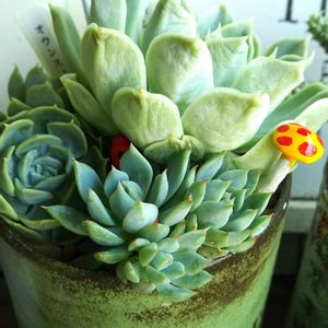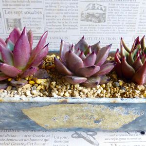 まとめ植え記録2、 これも〜セリアのプラ鉢ペイント😀 クラプトベリア・ローズクィーン、桃月、エケベリア・パーティードレスなど。 手前の3頭フリフリな子は(パーティードレス)多肉を始めた頃の葉挿し子🎵 確か葉から芽が出るのに半年ぐらい掛かった、、成長スロー過ぎな子だった💦 それから〜5、6年は経ってるんだけど、変わらず成長遅いw 葉っぱ1枚からここまで育ったと思えば〜可愛い我が子😊