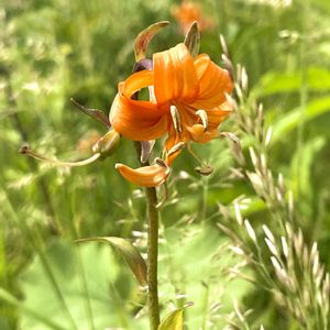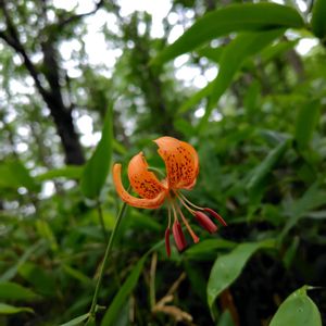オニユリに花の色や形が似ているけど花が小さく鈴なりな感じがとても可愛い。 小型系の百合の花なので庭にあったら可愛いなーと思いましたが、山の上に咲いてるので、うちの庭では溶けてしまうのでしょうね。