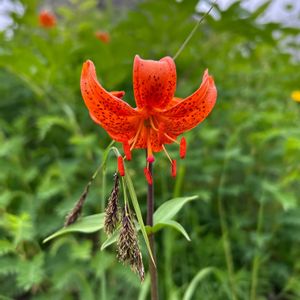 クルマユリ ユリ科ユリ属 多年草 北海道、本州の中部以北の高山帯〜亜高山帯に分布している。 冷涼な土地の草原に生育する。 和名は茎に輪生する葉を車輪の輻(や)に例えたことに由来する。 茎の高さは30〜100cm 花の大きさは5〜6cmで、茎の上部に1〜数個が互生する。 6枚の花被片はオレンジ色で濃紅色の斑点がある。 花期7〜8月 初めて見ましたが、とても小さなユリで、元気をもらいました。 🏷️日曜ビタミンカラー♪ に参加させていただきます。