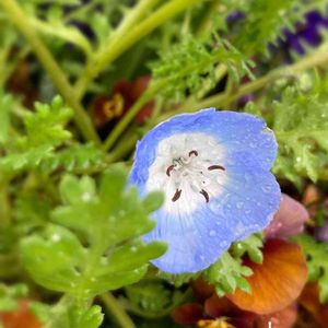 久しぶりの投稿✨ ネモフィラ 種から植えて放ったらかしでも咲いてくれました😅 葉っぱもギザギザでかわいい💕 今日は冷たい雨だけど、キラキラしてキレイ✨