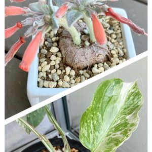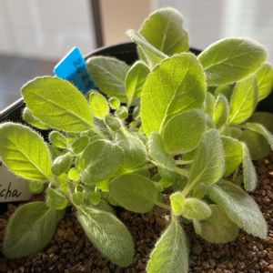 【断崖の女王】【イワタバコ科》 花言葉 「自由」「おもいのまま」 銀色のビロードに、不思議な形をした花を咲かせる植物。 ブラジルのパラナ州に自生するイワタバコ科の植物で、実際に切り立った崖などに自生しています。 一般的にイワタバコ科の植物は湿った場所を好みますが、断崖の女王は乾燥地でも生育が可能。 その理由として、葉がシワシワになっても再生するうえ、塊根とよばれる部分に水分を貯め、極度の乾燥から身を守っているのです。 また、ビロード状に毛の生えた葉っぱは、強い日差しから自らを守っているとも言われています。 断崖の女王に咲く花は、なかなか奇妙。 細長い花がぶら下がるようにして生えてきます。 どうしてこのような形になったのかというと、ハチドリが花粉を媒介するから。 ちなみに「子犬の耳」という別名で売られていたりします。 🏷️月曜日にビタミンカラーに参加します🧡💛。