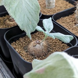 シンニンギア・レウコトリカ(断崖の女王)の実生です。少し前までは本物?という感じでしたが、ここ1ヶ月位で葉に産毛が増えてきて、塊根も膨らんできました。密集し過ぎているので植え替えしないとですがタイミングを悩み中です。3月頃が良いのかな・・・。