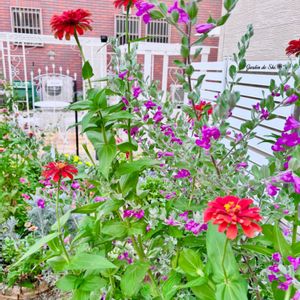 こんばんは♪ 今日は夜更かししています☕️⭐️✨ 昨日の庭です😊 ①ジニアとレウコフィルムのコラボです❤️🩷 レウコフィルムは3株あって1つは地植えにしました🤗 スクスク育って150cmに 2度目の満開です💕 ジニア❤️はダイソーの種まきっ子さん ②ブルーウィングがまた咲き始めました💙 ③名前不明のブルーローズ💜 香りも良くて綺麗💖癒されます🥰