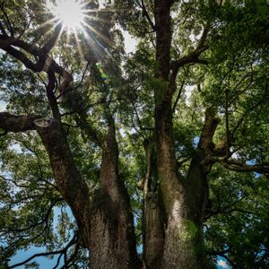 大きな木 5本ほど競い合うように密に聳えています。 椋の木?いえ楠の木かな🤗間違ってたら教えて下さい。 縦長パノラマpic貼^^🌿‼️