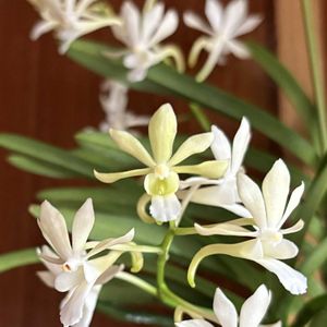 バンダ グリーンライト V.Green Light ①咲き始めて1週間を過ぎ、最後のお花が開花しました☺️🌸花色が淡いグリーンから白っぽく変化していきます。花径3㎝くらいです。 ②③全体のようす、根の1番長いところは40㎝くらいになりました