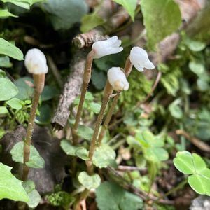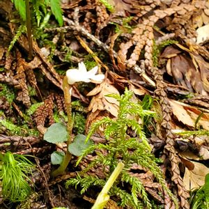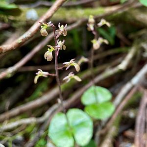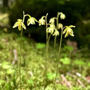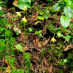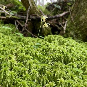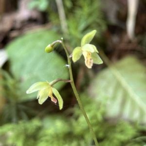 コイチヨウラン(小一葉蘭) 高さ10cmほど 陽の当たらない三股口登山道で1つだけ見つけました。 後から調べてコイチヨウランでしょうか? イチヨウランは1枚の葉と1本の花茎をだすそうですが、こちらは淡い黄緑色の花を2個と蕾がついてました。 苔の中に咲いていて葉っぱを探して撮る時間がありませんでした💦ピントも合わず🥹 急登の山道を仲間はどんどん先へ。焦って付いて行かなければ〜🥾 でも見過ごしそうな小さな小さなラン 出会えてよかった✨✨