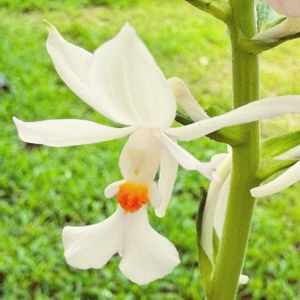 「ミディ胡蝶蘭 白」で名前合っているでしょうか? 半分くらい上の方の花が無い状態なので、セール価格(なんと1,000円)で買いました! 神奈川県 8月19日撮影