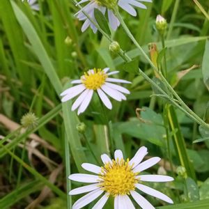 こんにちは🍀 今日のお花、ヨメナです💜🤍 2年前に野菊の美しさを再確認しましたが、やっぱり野菊は苦手意識があり、なかなか手が出せませんでしたが😅、 この前、花友さんがよく似たノコンギクとカントウヨメナの違いをわかりやすく教えて下さいました。 総苞の形が、ノコンギクはワイングラス🍷で、ヨメナはカクテルグラス🍸だそうです。 これは↘️、🍸ですね〜😋 ↖️は、筒状花の1列だけが咲き始めていて とっても可愛いです😍 おかげでヨメナとノコンギクの判別はバッチリです✌️😆、たぶんね〜😅 ペロさん、ありがとうございます🤗💓 ヨメナ (嫁菜) キク科 シオン属 多年草 在来種 別名 ウハギ・オハギ・ハギナ・ヨメガハギ・ヨメノサイ・カンサイヨメナ 名前の由来は嫁菜とも夜目菜とも言われ不詳。一説には、美しく優しげな花を咲かせるため、嫁の名がつくと言われている。 本州中部以西、四国、九州の山野のやや湿ったところや道端、あぜ道、土手などに生える。 根茎は長く匍匐する。茎は上部で分枝し、やや帯紫緑色で平滑。葉は互生し、下葉と中葉は長楕円状披針形で無柄、縁に粗い鋸歯がある。上葉は線状披針形。 花期は7~10月。 茎の頂に直径約3㎝の淡紫色の舌状花と黄色の管状花からなる頭花を付ける。舌状花は15~20個前後、総苞片は3列。 痩果は長さ3㎜の倒卵形で腺毛と剛毛があり、冠毛は長さ0.5㎜。 解熱、解毒、止血薬として利用。 葉は山菜として食用。天ぷら、あえもの、嫁菜ご飯が美味。