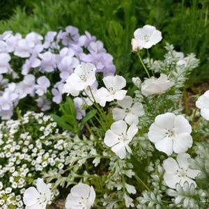 こぼれ種のネモフィラさんたちが咲き出しました 今年はあちこちにいろんな色が出てしまいましたがそれもまた良し😌 この斑入りのフロックスもお気に入りです♡ 秋に挿し芽したら発芽してくれた✨️