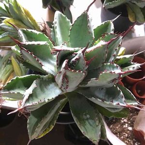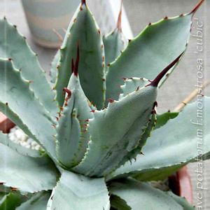 アガベのモンスト・キュービック。2枚の葉っぱが背中合わせにくっついて一枚になっているような不思議な葉をしている。マクロアカンサのモンストという説、ポタトラムのモンストという説を見かける。 先端の大きな棘だけでなく、葉の縁のギザギザも立派に痛い。、