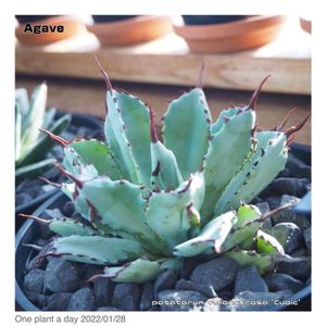One plant a day. Agave potatorum f.monstrosa 'Cubic' 1日飛んでるのに気付きました😱28日分です😅 水切り気味で管理していますが、部屋の中暖かいので、動きは止められず、じわじわと徒長😔まだ春は遠いのですが、だんだん日差しも強くなってきたので、もう少し頑張ってもらいます😤