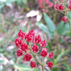 秋の日差しを浴びて赤く輝くイワショウブの実。 白い花に替わり赤い花が再び咲いたように美しい。